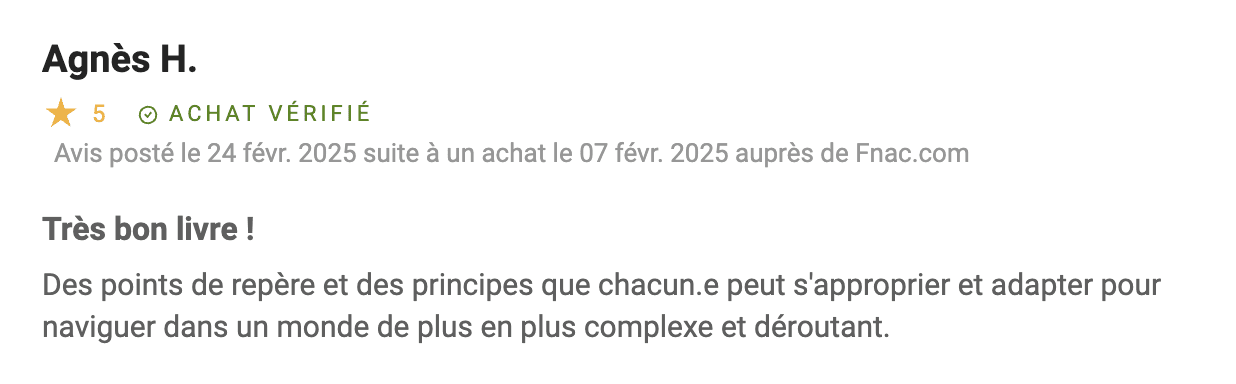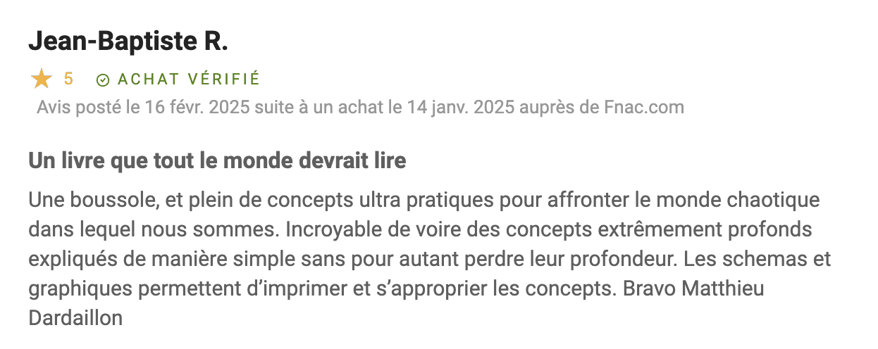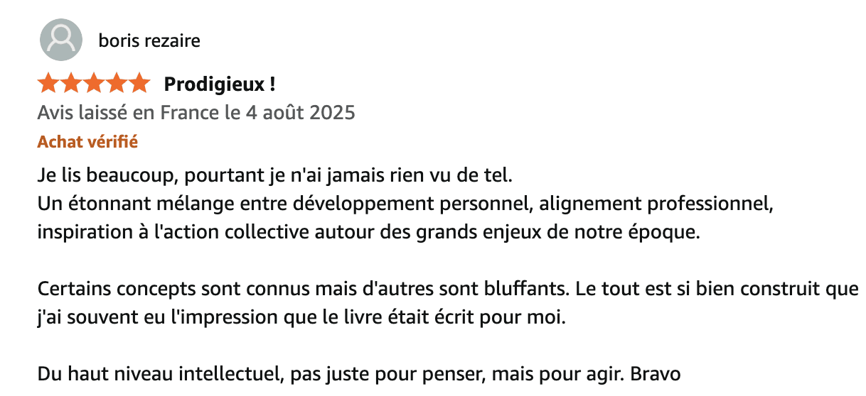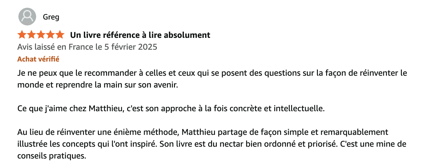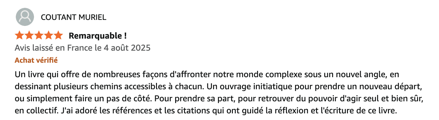 "Matthieu a réussi le tour de force de synthétiser de manière très accessible les concepts clés pour naviguer l’entre-deux mondes dans lequel nous vivons. Et puis de traduire ces concepts en outils à mettre en pratique, dans la joie et la simplicité."