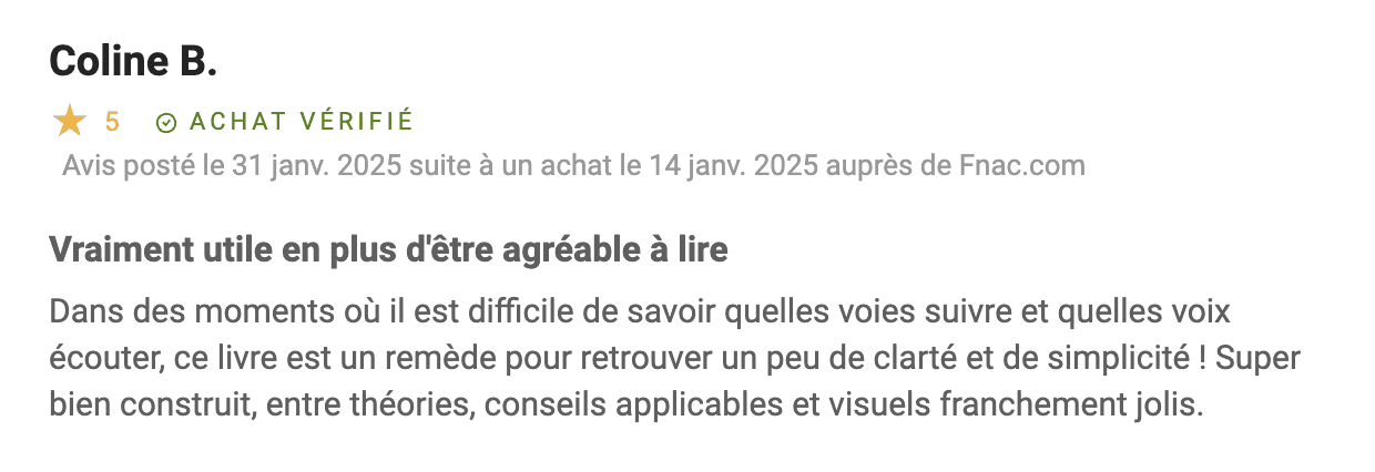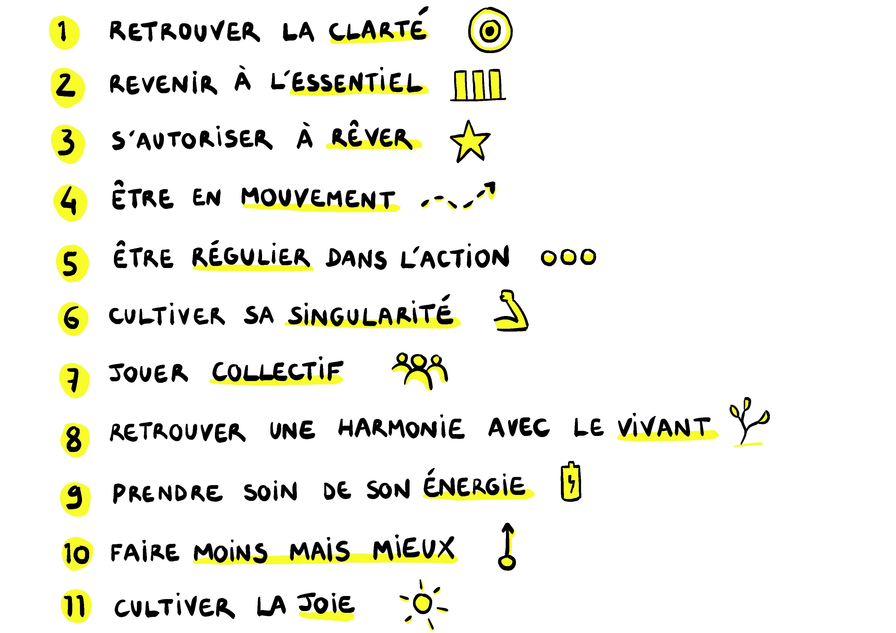 Dans ce livre concret et visuel, je partage les principes et outils qui m’ont été les plus utiles pour retrouver au quotidien du sens, de la simplicité, de l’efficacité et de la joie dans l’action.