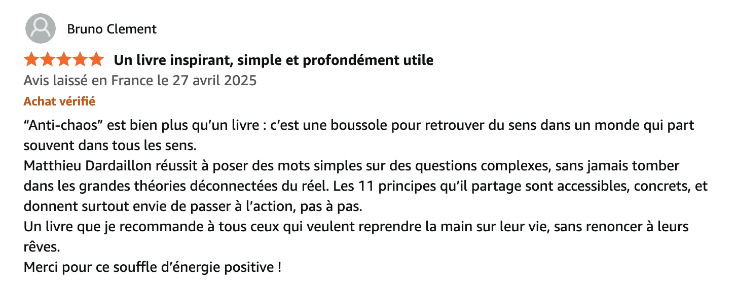 "Anti-Chaos, c'est plus qu'un livre... C'est comme un antidote, une boussole pour naviguer dans un monde de plus en plus incertain... À garder précieusement sur sa table de chevet !"